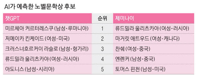 챗GPT는 남성 작가를 상위권에 주로 거론한 반면,구글 제미나이가 예측한 노벨문학상 작가는 1~3위가 모두 여성이어서 차이가 컸다. 1위는 류드밀라 울리츠카야,2위는 마거릿 애트우드,3위는 찬쉐였다. 이에 대해 제미나이는 답변에서 "울리츠카야는 단순한 여성 작가를 넘어 정치적 억압에 저항하는 러시아 작가란 특수한 상징성을 지니고 있다. 그녀의 수상이 가져올 국제적 메시지와 파급력이 '연속 여성 수상'이란 통계적 부담을 상쇄할 만큼 크다고 본다"고 썼다. 울리츠카야는 지하출판물(사미즈다트)을 소지·유포했다는 혐의로 다니던 연구소에서 해고되는 등의 전력이 있는 작가다.