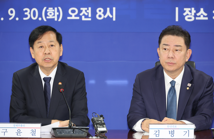 김병기 더불어민주당 원내대표(오른쪽)와 구윤철 경제부총리 겸 기획재정부 장관이 30일 국회에서 열린 ‘경제형벌 민사책임 합리화 태스크포스(TF)’ 당정 협의에서 발언하고 있다. [사진출처=연합뉴스] 더불어민주당과 정부가 과도한 경제 형벌로 기업의 정상적 경영 판단을 어렵게 만드는 배임죄 폐지를 추진한다고 30일 밝혔다.