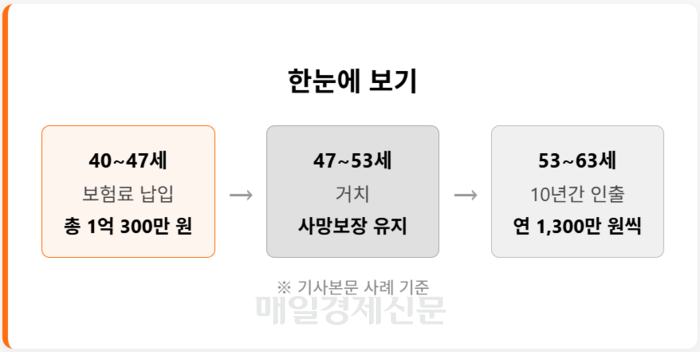 예를 들면 40세 남성이 매달 120여만원을 7년간 내는 종신상품에 가입하면 47세 때 1억300여만원의 보험료 납부를 마치게 된다. 이후 거치 기간 5년을 마친 53세부터는 보험료를 10년에 걸쳐 인출할 수 있다. 가입자는 매년 보험료를 10%씩 인출하거나 원하는 시점에 목돈으로 사용할 수 있고 사망 보장도 유지된다.