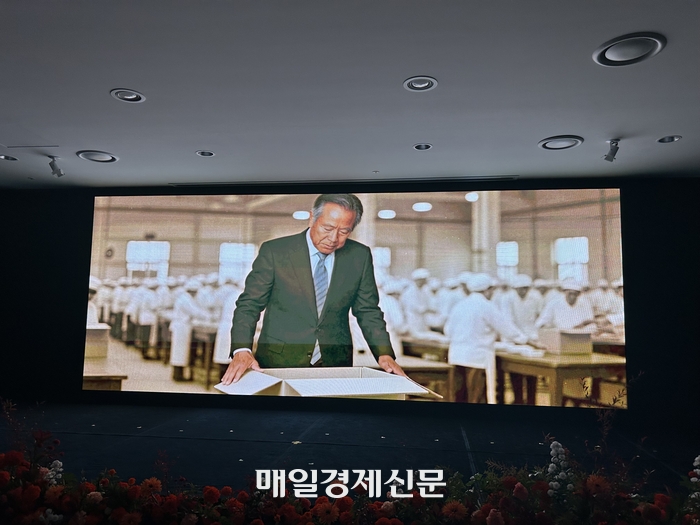 AI로 구현된 고 전중윤 명예회장의 모습. [변덕호 기자] 이날 행사에서는 전 명예회장의 살아생전 모습이 AI로 구현돼,삼양 공장에서 근무하는 직원들과 함께 일하는 장면을 담은 영상도 공개됐다. 영상 속 전 명예회장은 김 부회장을 향해 “시간은 흘러도 정신은 남는 법이지. 사람을 향하는 마음이 담긴 삼양1963을 지금의 시대에 잘 전해주라”고 당부했다.