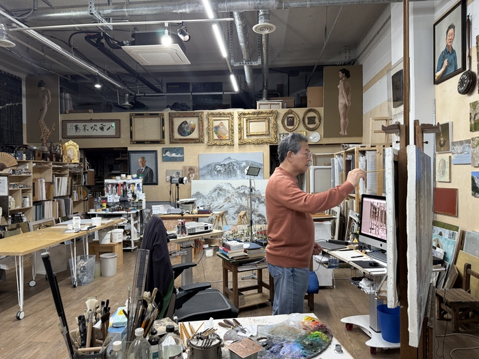 초상화가로 유명한 이원희 작가가 경기도 고양시 삼송 작업실에서 그림을 그리고 있다. <이향휘 기자>