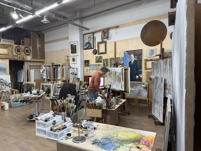 지난달 말 찾은 경기도 고양시 삼송테크노밸리. ‘웅~’ 하는 기계음과 지게차 소리가 공장 지대 풍경을 연상케 했다. 차량이 길게 서 있는 옆 문을 열자 딴 세상이 펼쳐졌다. 사방 벽에는 누드화와 초상화가 걸려 있고,자작나무 겨울 풍경이 이젤 위에서 채색을 기다리고 있었다. 초상화가 이원희(69)의 화실이다. 7m가 넘는 높은 층고에서 뿜어져 나오는 개방감이 압도적이었다.