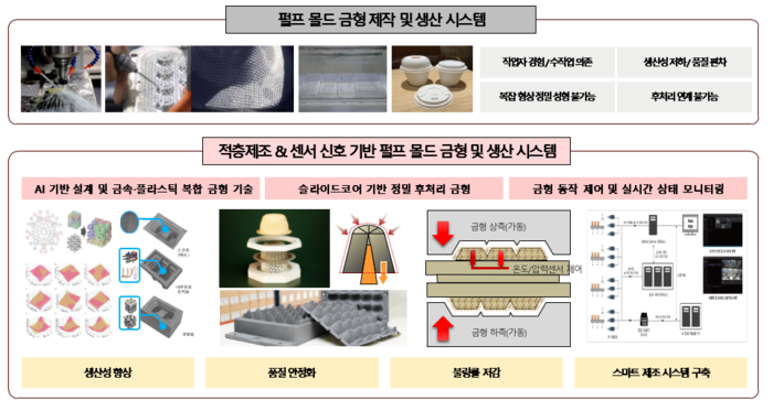 < 케이랩스와 크라프솔루션-한국기계연구원-무림피앤피가 개발하는 적층제조&센서 신호 기반 펄프 몰드 금형 및 생산 시스템 / 사진 제공 : 케어랩스 > 케이랩스 김원효 대표는 “친환경 패키징 수요 확대에도 기존 금형 기술의 한계로 정밀도 확보와 생산성 향상에 어려움이 있었다”라며 “적층 제조 기반 전 공정 인프라와 핵심 기술을 보유한 자사의 핵심 역량을 활용하여 3D 프린팅 기반 금형 제조 기술과 AI 제어 기술을 융합해 이러한 문제를 실질적으로 개선해 나가겠다”라고 말했다. 이어 “이번 과제를 통해 펄프몰드 금형의 정밀 성형과 공정 스마트화를 앞당기고 친환경 패키징 산업의 기술 경쟁력 강화에 기여하겠다”라고 강조했다.