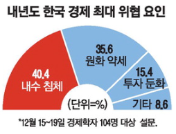 고환율·고물가는 내수 침체를 유발할 수 있다. 이번 설문에서 경제학자들은 내년 우리 경제를 위협하는 최대 리스크로 ‘내수 침체(40.4%)’를 꼽았다. 원화 약세(고환율)를 지목한 학자가 35.6%로 뒤를 이었다. 내수 침체와 고환율은 동전의 앞뒷면과 같다.