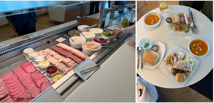 에어프랑스 라운지에서 제공하는 음식. /사진= 강예신 기자 ‘미식의 나라’답게 베이커리와 유제품의 퀄리티가 돋보였다. 갓 구워낸 바삭한 빵과 풍미 깊은 버터,신선한 햄과 치즈의 조합은 프랑스 라운지에서만 가능한 경험이었다.