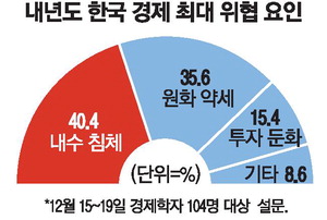 "내수침체·고환율, 韓경제 최대위협"경제학자 104인 설문조사응답자 절반이 '원화값 1450~1500원 이상' 꼽아"물가 2% 넘게 상승" 85% … 양극화 심화 우려도