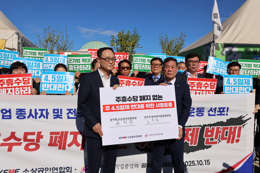 소상공인 업계가 '주휴수당 폐지 없는 주 4.5일제 도입'을 반대하는 100만 서명운동에 나선다. 15일 소상공인연합회는 서울 국회 정문 앞에서 한국외식업중앙회와 공동 기자회견을 열었다. 송치영 소공연 회