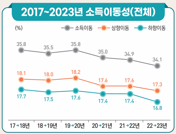 2023년 소득이동통계 상향이동 23%로 전 세대 중 가장 높아 하향이동도 17.4%… 중장년층보다 높아 1분위 탈출률 38.4%, 전년비 1.7%p 감소 “청년층 내부 양극화… 맞춤형 정책 절실”